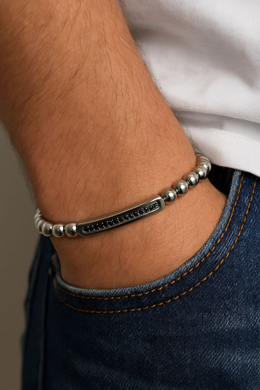 Bracelet Acier Argenté et Pierres Noires
