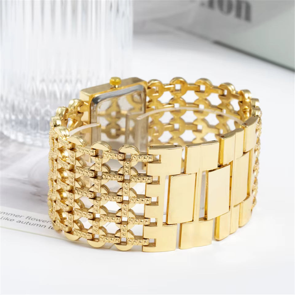 Son bracelet large à maillons dorés lui confère une allure royale, tandis que son cadran rectangulaire embelli de cristaux scintillants apporte une touche glamour parfaite pour toutes les occasions.