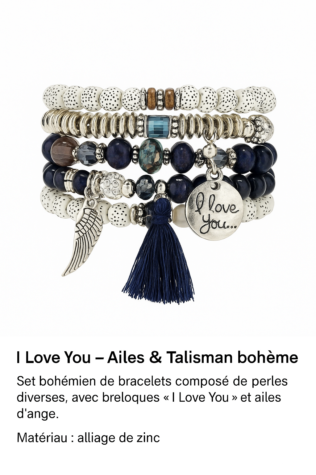 Plongez dans l'élégance et la profondeur spirituelle avec ce set de 4 bracelets superposés, ornés de perles marbrées blanches, de perles bleu nuit et d’éléments argentés. Chaque détail symbolise la protection, l’amour et l’harmonie universelle. Le pendentif 'I Love You' et l’aile d’ange rappellent la force des liens affectifs et la liberté d’esprit. Un bijou tendance et spirituel à porter chaque jour.