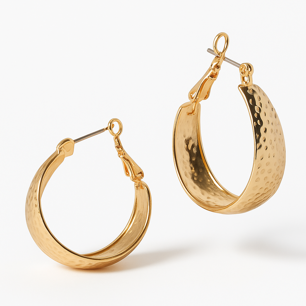 Des créoles dorées au design martelé, parfaites pour donner du caractère à votre style. Portées ici par un modèle européen au look casual, elles révèlent leur côté chic et moderne. Un bijou tendance qui se marie aussi bien avec un jean qu’une tenue habillée.