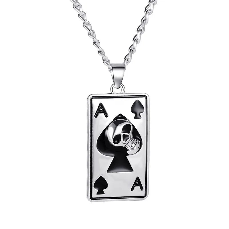 Ce pendentif puissant associe le symbole mythique de l’As de Pique à un crâne 3D finement sculpté, créant un bijou au style rock affirmé.